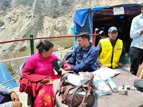 एसडीआरएफ टीम के साथ मौजूद फार्मासिस्ट द्वारा श्रद्धालुओं को आवश्यक चिकित्सीय सुविधाएं प्रदान की जा रही
