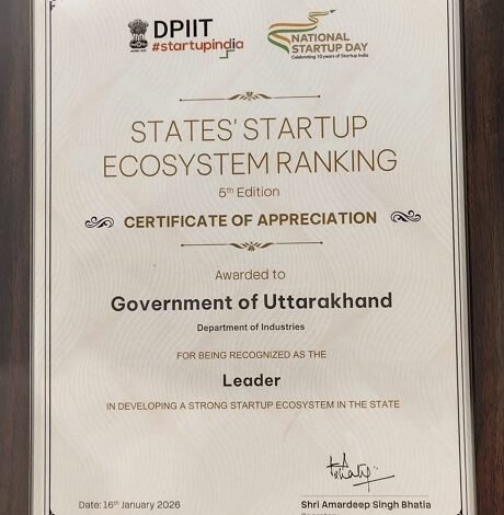 भारत सरकार के वाणिज्य एवं उद्योग मंत्रालय के अंतर्गत उद्योग संवर्धन एवं आंतरिक व्यापार विभाग (DPIIT) द्वारा जारी States’ Startup Ecosystem Ranking (5वां संस्करण) में उत्तराखण्ड को मजबूत स्टार्टअप इकोसिस्टम विकसित करने में ‘लीडर’ के रूप में मान्यता प्रदान की गई है। इस उपलब्धि के लिए राष्ट्रीय स्टार्टअप दिवस के अवसर पर उत्तराखण्ड सरकार के उद्योग विभाग को Certificate of Appreciation प्रदान किया गया। इस सम्मान से यह स्पष्ट होता है कि उत्तराखण्ड में स्टार्टअप नीति के जरिए नवाचार, उद्यमिता, निवेश प्रोत्साहन और युवाओं को स्वरोजगार से जोड़ने में कामयाब रहा है, जिसे अब राष्ट्रीय स्तर पर सराहा जा रहा है। उत्तराखंड की उपलब्धि को राष्ट्रीय स्तर पर एक मॉडल के तौर पर भी देखा जा रहा है।